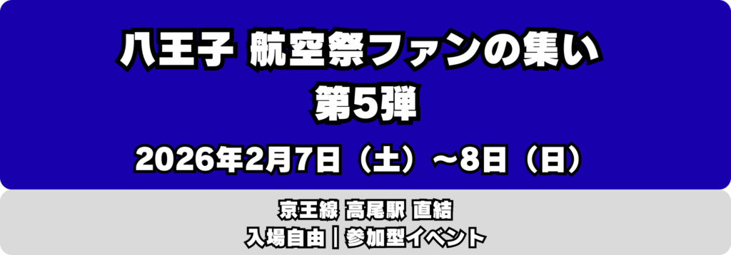 【2026年2月7日・8日|京王線 高尾駅直結会場】 航空祭ファンの皆さま、お待たせしました。「八王子 航空祭ファンの集い」第5弾の開催が決定しました! 今回の会場は、...